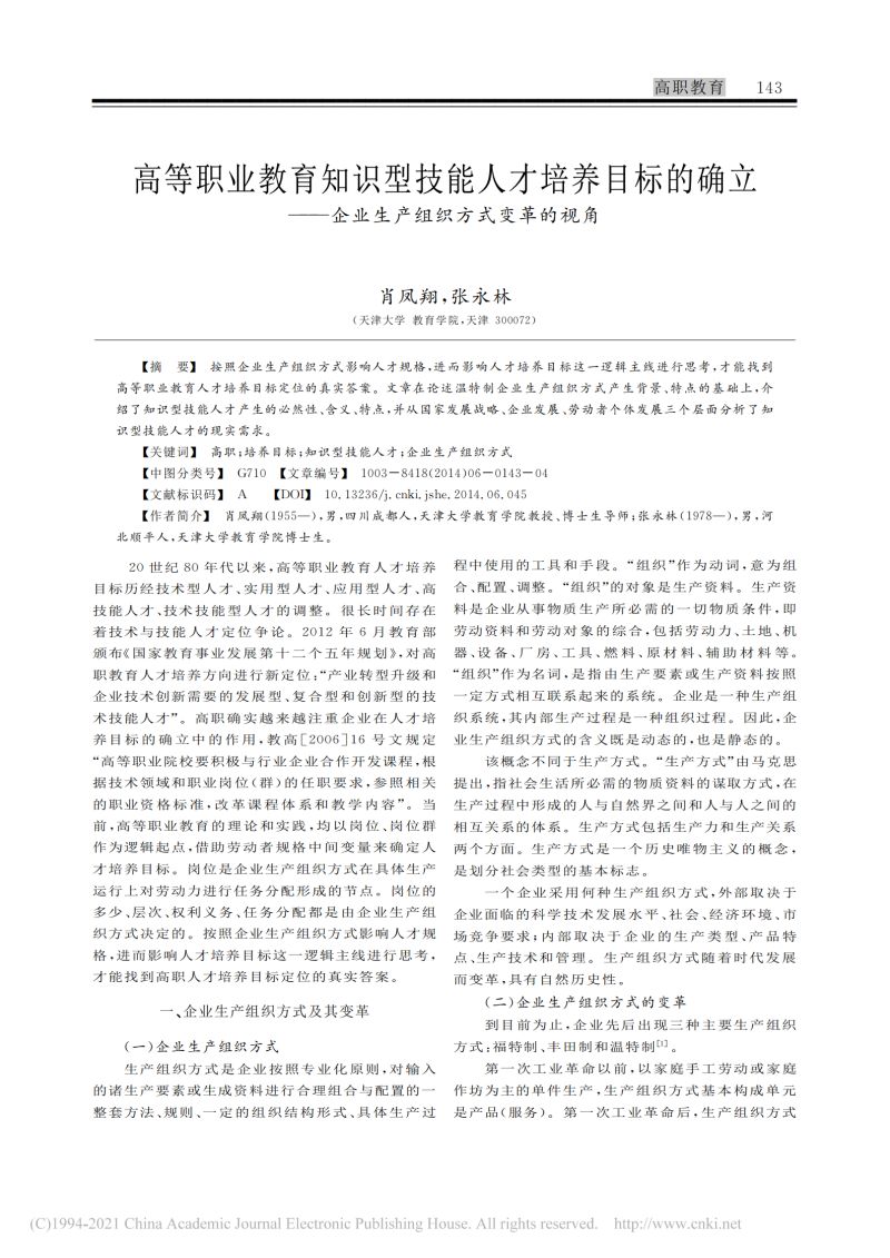 高等职业教育知识型技能人才培养目_省略_确立_企业生产组织方式变革的视角